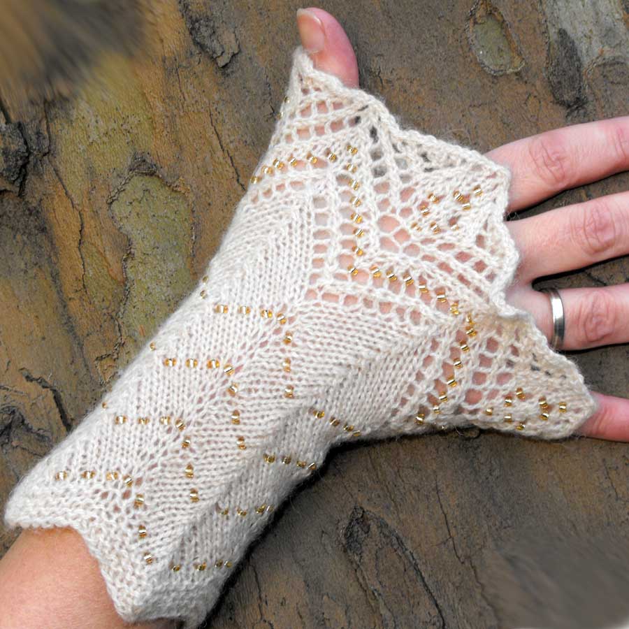 Eine elegante Armstulpe mit Perlen und schöner Spitze. Strickanleitung. Strickmuster mit Strickschrift.