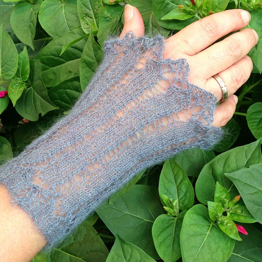 Zarte Armstulpen mit schöner Strickspitze. Strickanleitung. Strickmuster mit Strickschrift.