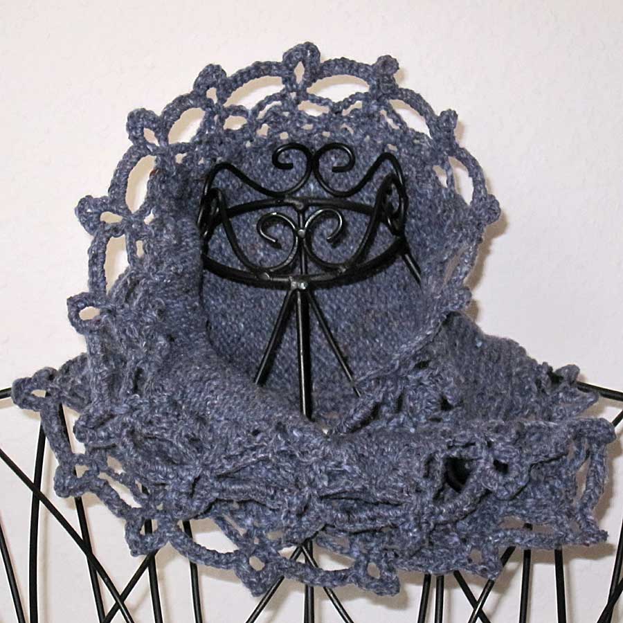 Ein auffälliger Schalkragen mit dem gewissen Etwas. Der Schalkragen *Nora* wird innen gestrickt und außen mit mit einer Häkelspitze versehen. Strickanleitung mit Häkelschrift.