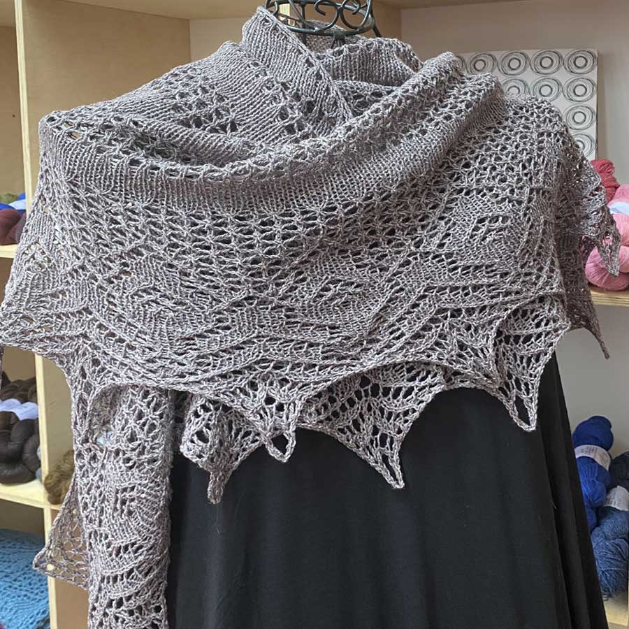 Das Tuch *Coccola* hat eine gebogene Nackenlinie und lässt sich damit sehr abgenehm tragen. Es hat ein einfaches Innenmuster und eine ausgeprägte, ornamentale Strickspitze. Gestrickt von Birgit Freyer