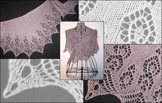 Das Tuch *DolceV* hat eine aufwändige und ausgeprägte Spitze. Die Spitze ist mit Perlen versehen. Gestrickt von Birgit Freyer.