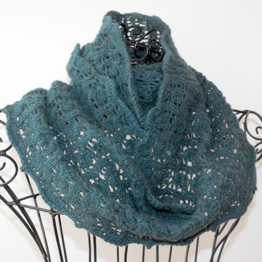 *Shilasdair* ist ein Loopschal, der 2 bis 3 x um den Hals geschlungen werden kann. Das Modell hat eine welliges Lochmuster. Strickanleitung. Strickmuster mit Strickschrift.
