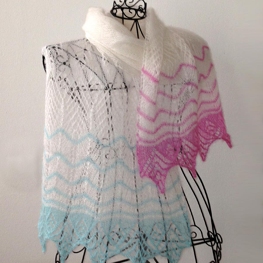 Der Schal *Bellina* hat ein grafisches Muster. Die Enden werden in unterschiedlichen Farben gestrickt und machen den Schal damit besonders wirkungsvoll. Es wird mit einem provisorischen Anschlag begonnen, um eine Naht zu vermeiden und beide Seiten mit dem gleichen Muster enden zu lassen. Strickanleitung. Strickmuster mit Strickschrift.