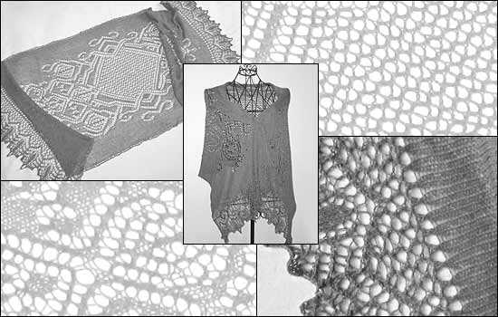 Die Stola *DivaVincenza* hat ein ornamentales Mittelstück und ausgeprägte Spitzen, die an beiden Enden angestrickt werden. Gestrickte Stola mit Strickspitze. Strickanleitung mit Strickschrift.