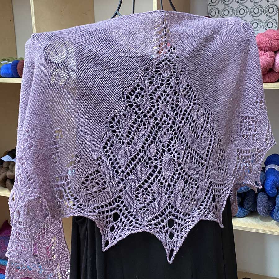 Gestricktes Schaltuch mit Strickspitze *Florentina* mit gebogener Nackenlinie. Das Tuch wird von der Mitte aus gestrickt und hat ein ornamentales Muster, das in eine Spitze übergeht. Strickanleitung mit Strickschrift.
