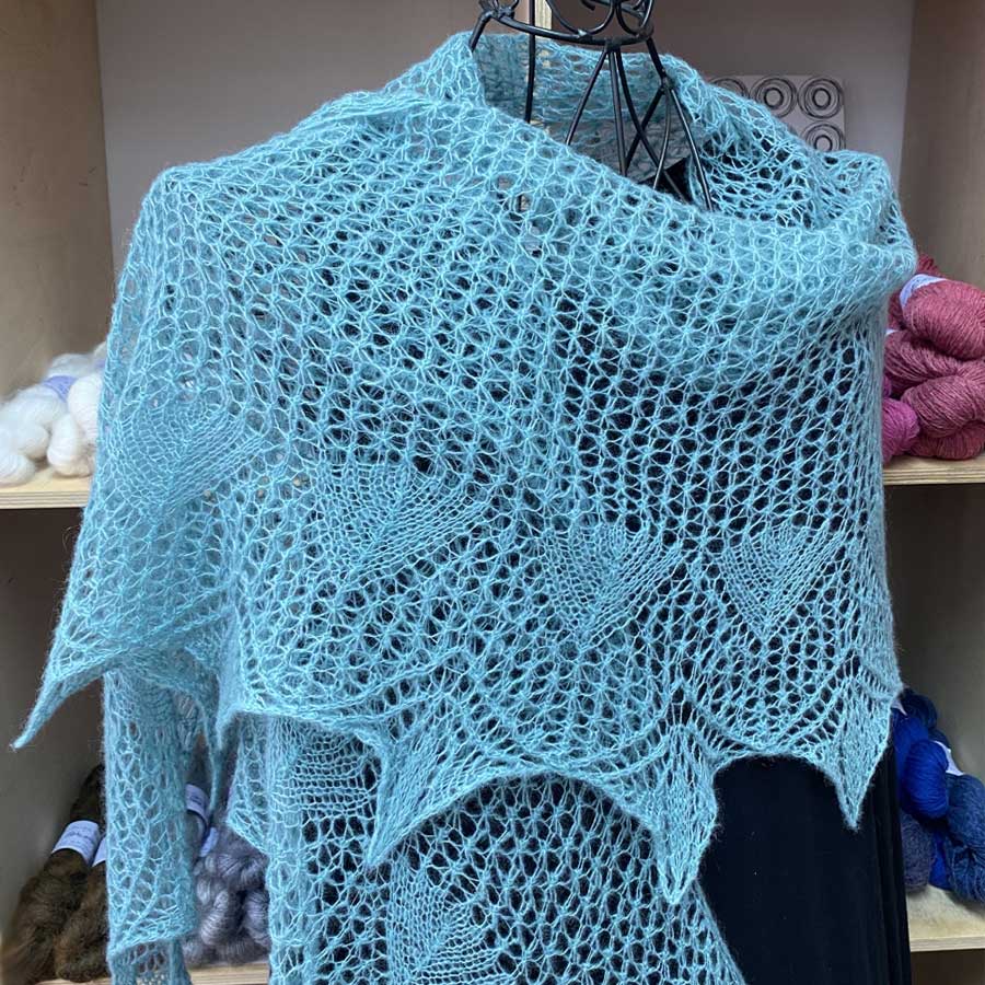 *Molina* ist ein luftiges Tuch in Bananenform mit schöner Strickspitze. Das Tuch wird von der Mitte aus gestrickt. Strickanleitung. Strickmuster mit Strickschrift.