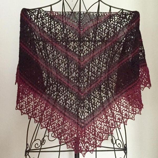 Das Tuch *NuitRouge* hat eine Bananenform und wird mit 2 Farben gestrickt - kontrastreich oder Ton-in-Ton. Durch den Wechsel von Lochmuster und andersfarbigen Rippen ist das Tuch besonders effektvoll. Strickanleitung mit Strickschrift.