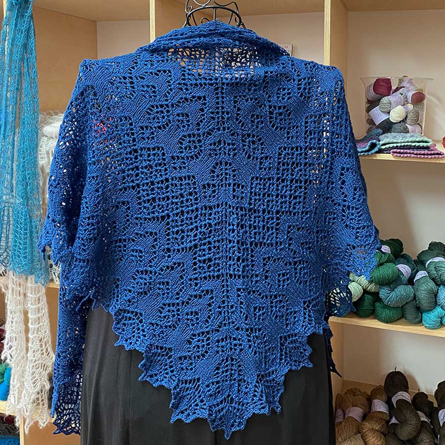 Das Tuch *Undina* ist ein Dreieckstuch mit einem ausgeprägten Muster - einem Mix aus grafischen und ornamentalen Elementen - und einer ausgeprägten Spitze. Anleitung mit Strickschrift.