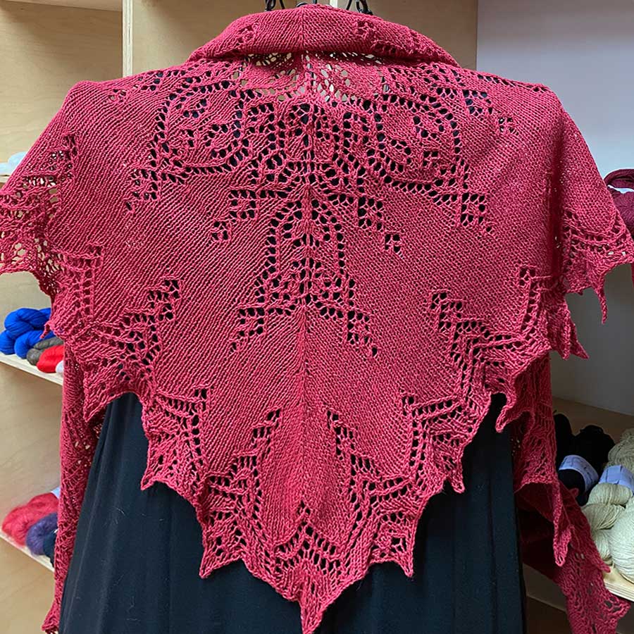 Ein schönes, auffälliges Tuch *Poesie* mit romantischen Ornamenten und ausgeprägten Spitzen - Tuch *Poesie* in Bananenform. Strickanleitung mit Strickschrift.