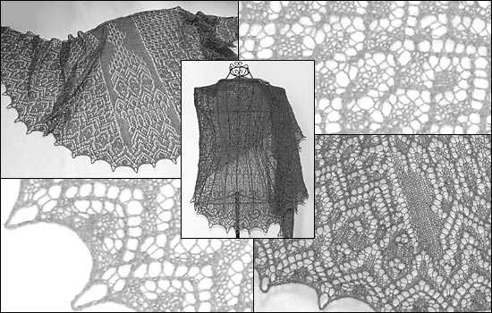 Das Färöertuch *Helena* hat ein grafisch ornamentales Muster. Gestricktes Schultertuch mit Strickspitze. Das Tuch wird von der Mitte (am Nacken) aus gestrickt. Strickanleitung mit Strickschrift.