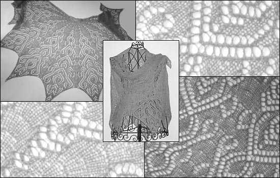 Gestricktes Halbrundtuch *Donzella*mit einem ornamentalen Muster und ausgeprägten Strickspitzen. Das Tuch wird von der Mitte aus gestrickt. Strickanleitung. Strickmuster mit Strickschrift.