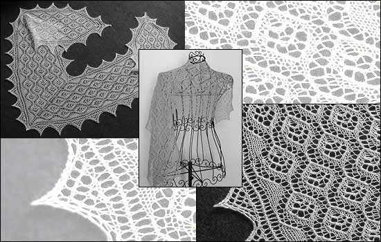 Das Tuch *Luisa* hat eine ganz besondere Form und lässt Sie mit vielen Tragvarianten spielen. *Luisa* wird an der Spitze angeschlagen und wird bis zu einer gewissen Breite als Dreieck gearbeitet, danach wird die Arbeit halbiert, rechts und links werden 2 Schalstreifen gestrickt. Die Mitte wird mit einem gleichmässigen sich wiederholenden Grundmuster gestrickt; an den Innen- und Aussenkanten entstehen durch das Strickmuster die Spitzen gleich mit und müssen nicht nachträglich angestrickt werden.