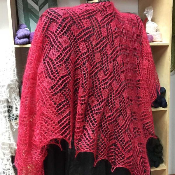 Das Tuch *Ruby* hat ein grafisches Muster und eine Lacespitze. Ein Tuch in Winkelform. Strickanleitung mit Strickschrift.