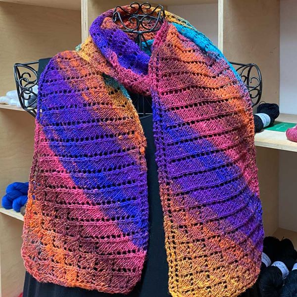 *GaudyTime* ist eine wirklich tolle Anleitung. Ich habe diesen Schal gestern fertig gestrickt, nachdem mich das Strickzeug 2 Wochen lang überall hin begleitet hat - wirklich überall! In Bus, Bahn, Wartezimmer, und, und, und. Der Mustersatz ist sehr leicht zu merken, sodass ich den größten Teil des Schals auswendig gestrickt habe und nur für Anfang und Ende aufs Blatt schauen musste. Das grafische Muster aus Karos und Linien bringt den Farbverlauf des Garns (ich habe eine *BellaMia* verstrickt) sehr schön zur Geltung, und ich hatte viel Spaß daran, den Schal wachsen zu sehen.